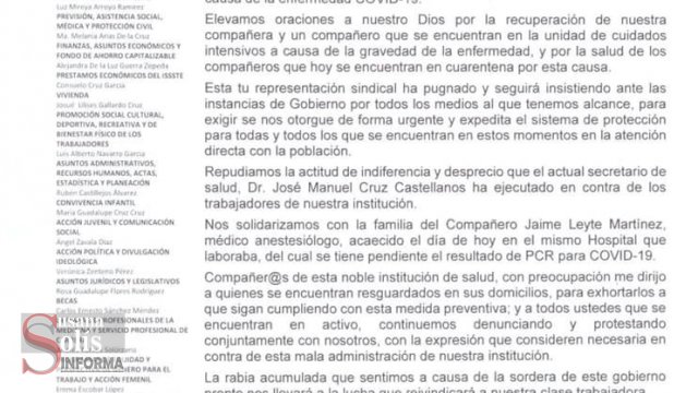 A través de un comunicado, la dirigente de la sección 50 del Sindicato de Salud, María de Jesús Espinoza Santos, dio a conocer de dos trabajadores de salud que se encuentran en cuidados intensivos y el deceso presuntamente por Coronavirus del médico anestesiólogo, Jaime Leyte Martínez.