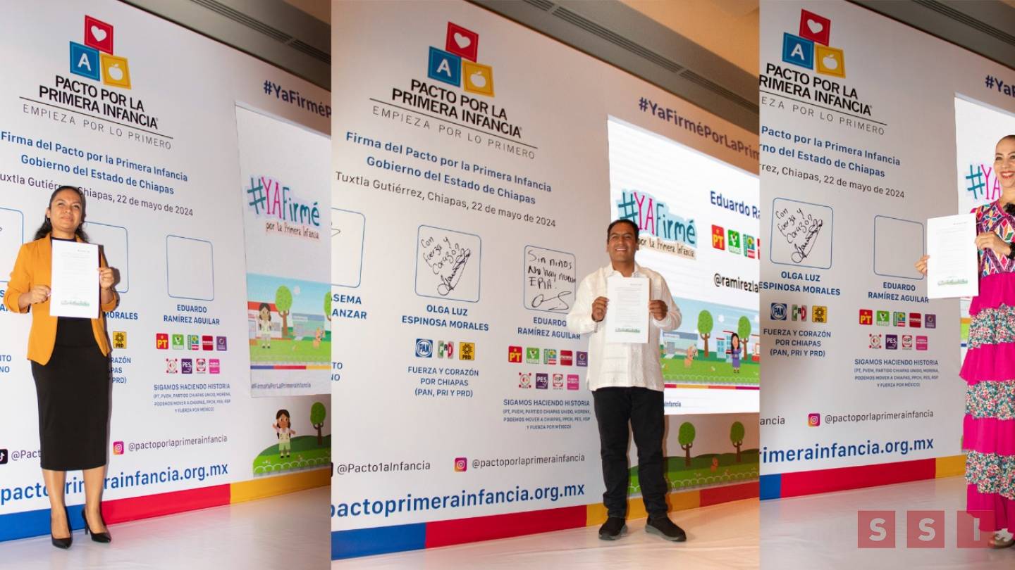 Las candidatas y el candidato a la gubernatura de Chiapas, Karla Irasema Muñoz Balanzar (Movimiento Ciudadano), Olga Luz Espinosa Morales (PAN, PRI y PRD) y Eduardo Ramírez Aguilar (PT, PVEM, Chiapas Unido, Morena, Podemos Mover a Chiapas, PPCH, PES, RSP, y Fuerza por México) firmarán hoy el Pacto por la Primera Infancia a favor de más de 800 mil niñas y niños menores de 6 años en el estado, con lo cual se comprometen a trabajar por su desarrollo, bienestar y el cumplimiento pleno de sus derechos.