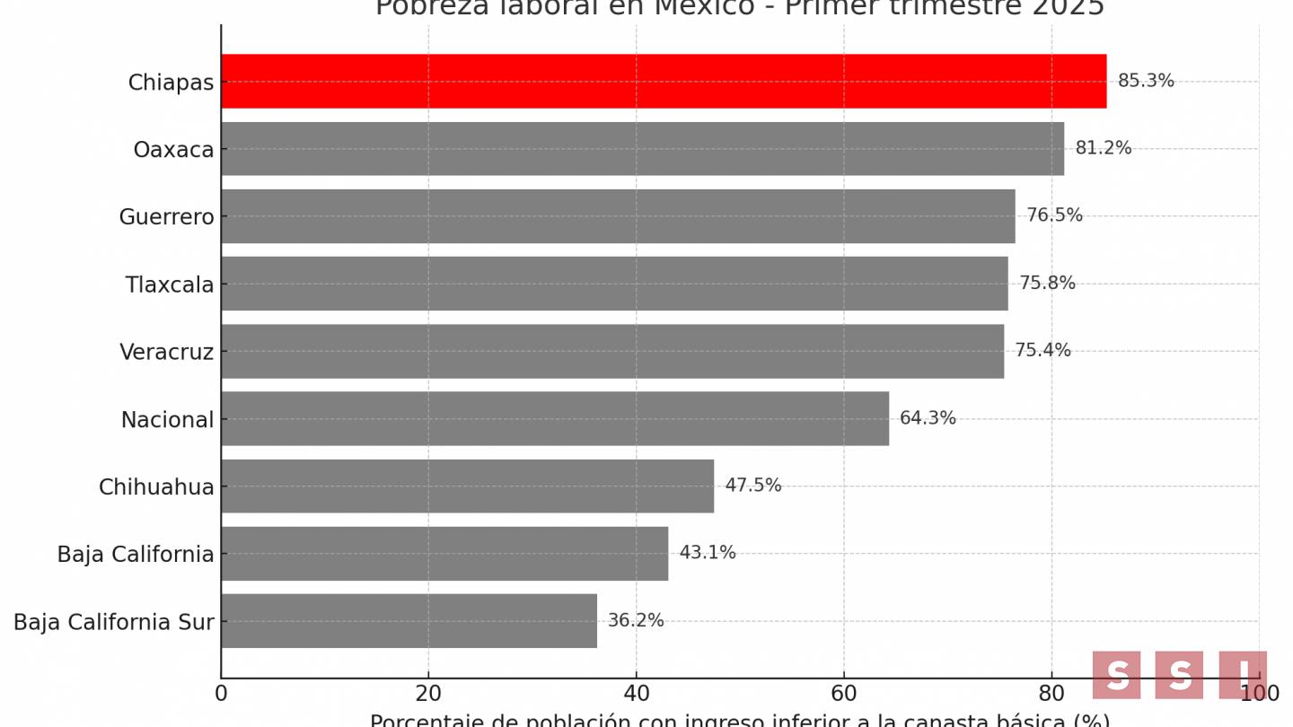 Chiapas encabeza la lista de entidades con mayor proporción de personas cuyo ingreso per cápita es inferior al costo de la canasta básica alimentaria y no alimentaria, con un preocupante 85.3% de su población en esta situación, según el más reciente informe del observatorio México, ¿Cómo Vamos?, con datos del INEGI correspondientes al primer trimestre de 2025.