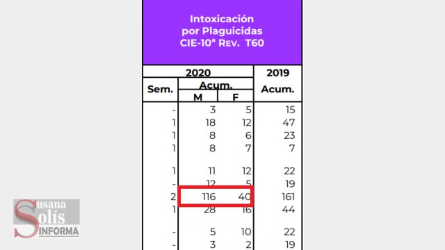 La secretarÃa de Salud Federal dio a conocer que hasta la semana 41 del Reporte Epidemiológico Nacional de Vigilancia, 156 personas se han intoxicado en Chiapas por plaguicidas.