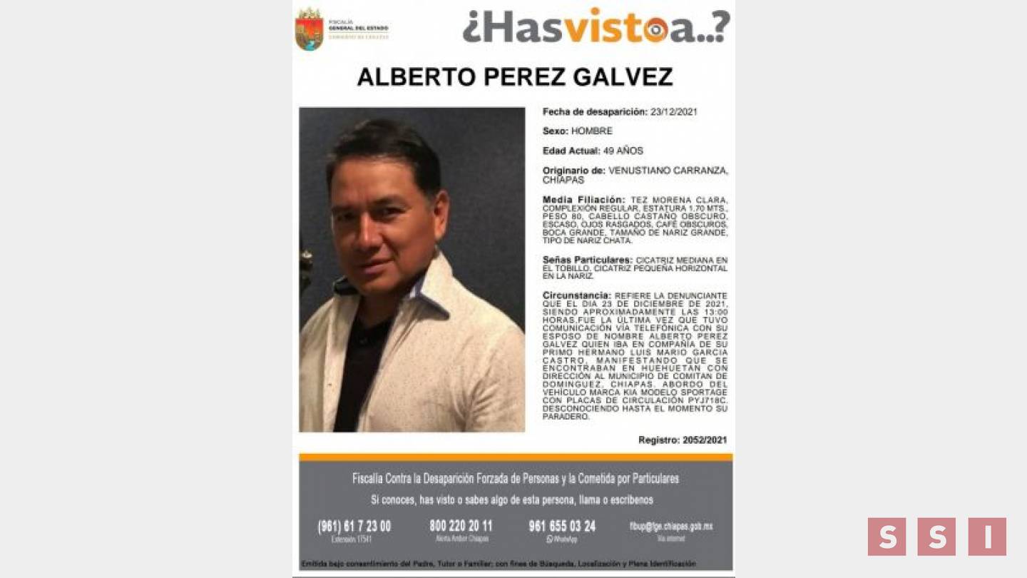 Familiares, colectivos y redes internacionales, lanzaron un llamado urgente a las autoridades de Chiapas para dar con el paradero inmediato del defensor de Derechos Humanos, Alberto Pérez Gálvez y Luis Mario García Soto, quienes están desaparecidos desde el pasado 23 de diciembre.