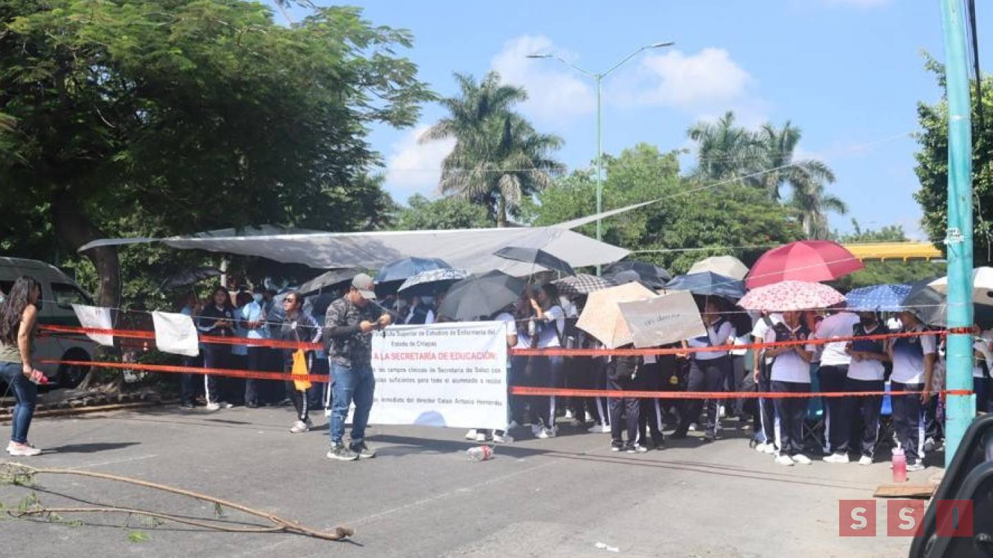Alumnos de la Carrera de Nivel Técnico del Instituto Superior de Estudios de Enfermería del Estado de Chiapas, mantienen bloqueado el Bulevard Belisario Domínguez de un solo carril en Tuxtla Gutiérrez.