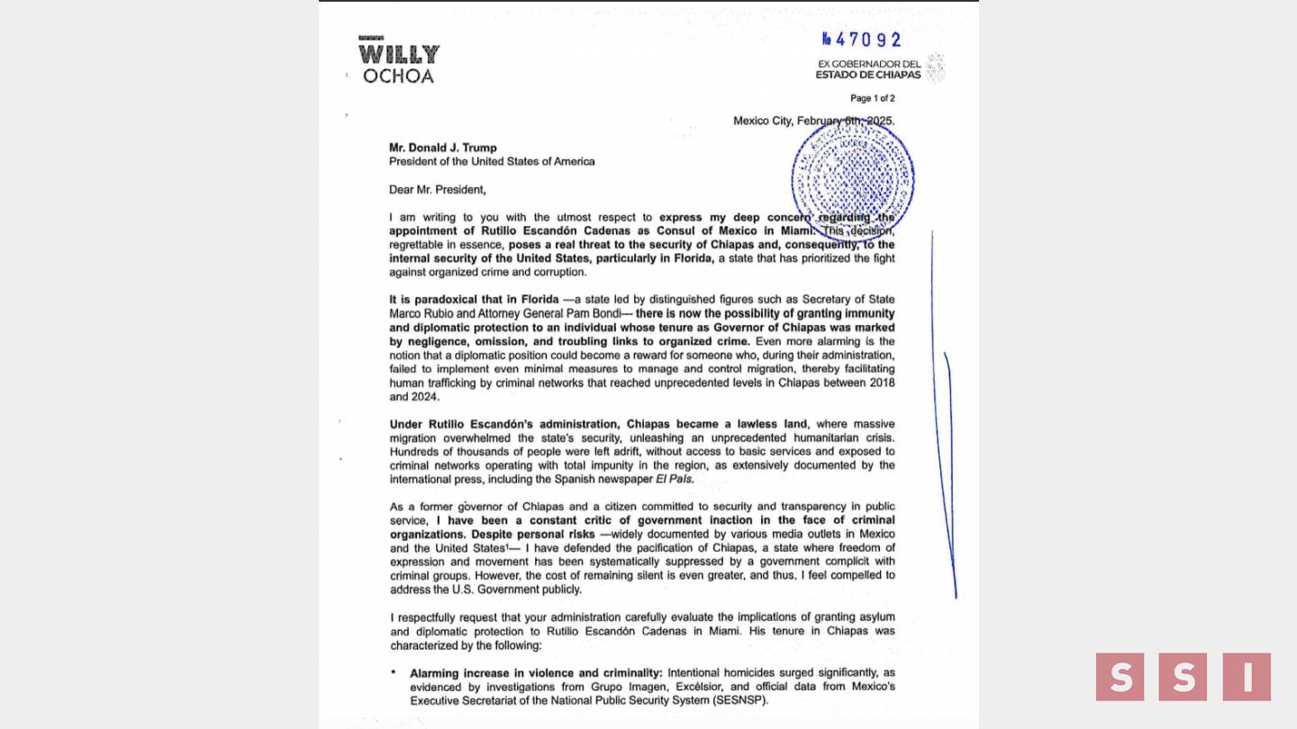 El priista y ex gobernador de Chiapas, Willy Ochoa envió una carta al presidente de Estados Unidos, Donald Trump donde menciona que el ex mandatario estatal Rutilio Escandón Cadenas representa una amenaza para ese país.