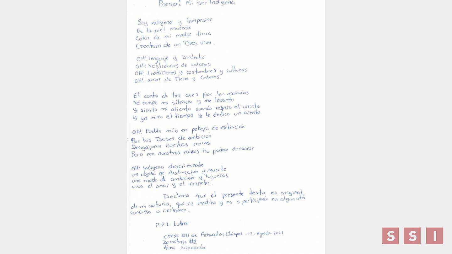 Luber "N", persona privada de la libertad en el Centro Estatal de Reinserción Social para Sentenciados (CERSS) número 11 de Pichucalco, obtuvo el primer lugar en el XXVI Concurso Nacional de Poesía "Salvador Díaz Mirón" 2021 en lengua indígena.