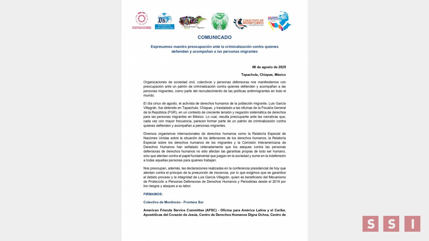 Las organizaciones reiteraron que el trabajo de defensa de derechos humanos no debe ser criminalizado, y pidieron al Estado mexicano adoptar medidas urgentes para proteger a quienes acompañan a las personas migrantes en condiciones de extrema vulnerabilidad.
