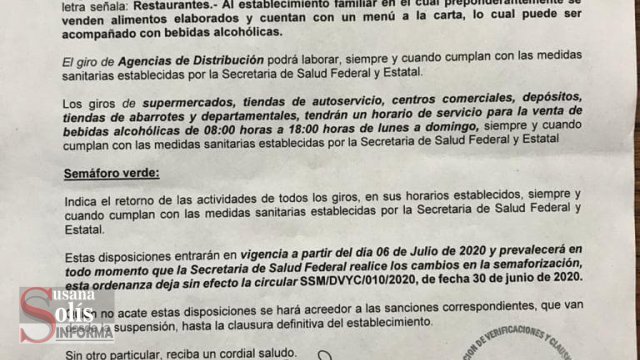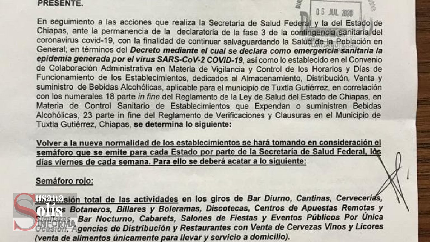 El oficio firmado por el director Roberto Mijangos Nucamendi especifica que tendrá vigencia del lunes 6 de julio y prevalecerá todo momento que la secretaría de Salud Federal realice los cambios en la semaforización y deja sin efecto el documento del pasado 30 de junio que hacía referencia al semáforo naranja.