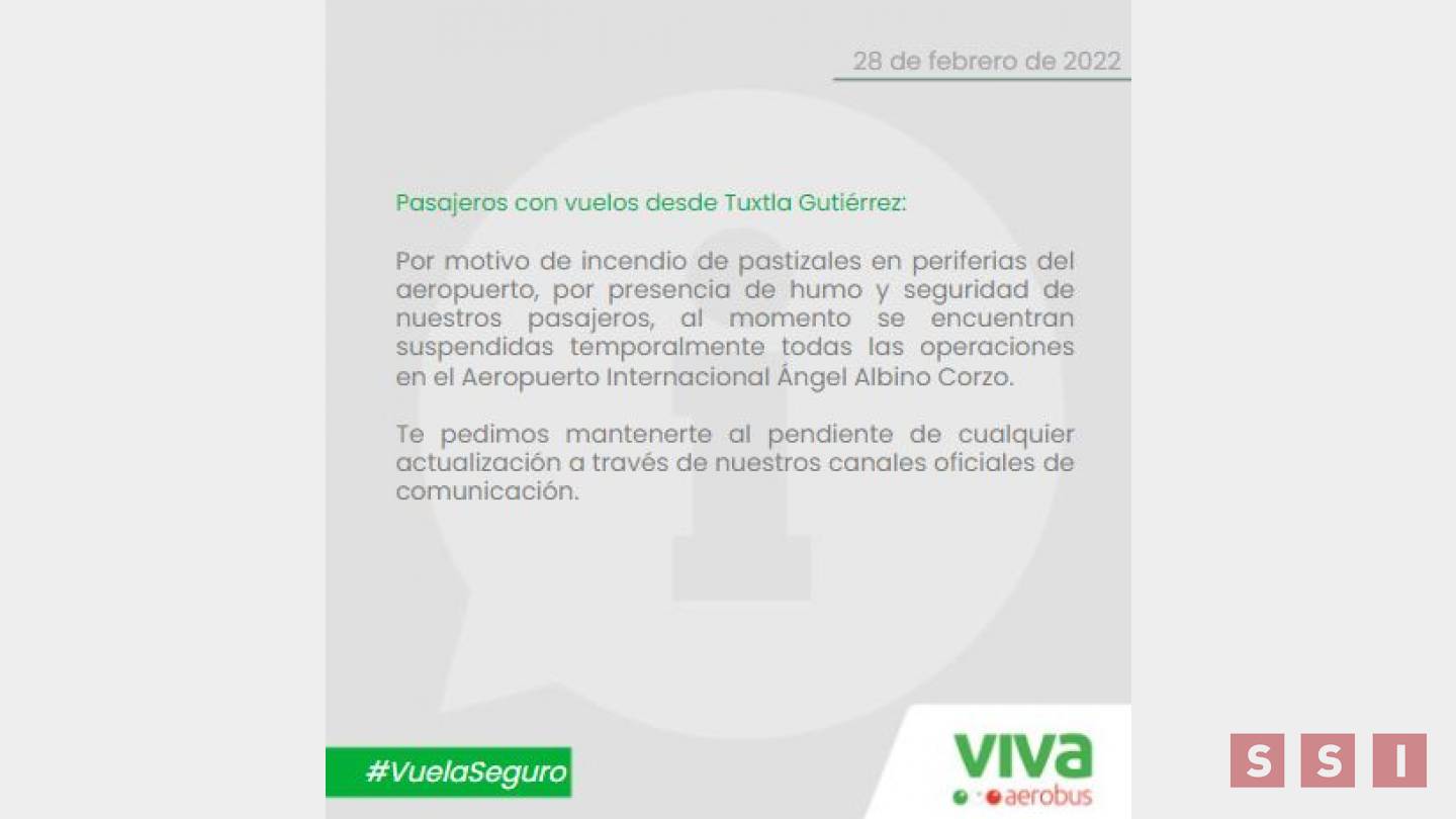 Derivado del incendio de pastizal a unos metros del aeropuerto Ángel Albino Corzo, la aerolínea Viva Aerobus informó que, por la presencia de humo y seguridad de los pasajeros, la tarde-noche de este lunes se suspendieron temporalmente todas las operaciones, que dejó a decenas de pasajeros varado.
