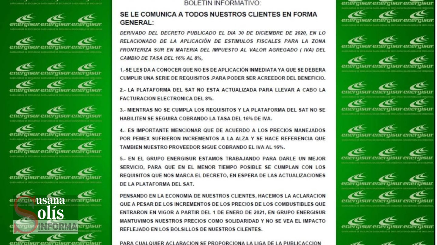 Hasta este 5 de enero de 2021, en los 18 municipios chiapanecos que comprende el decreto no ha sido aplicada la disposición oficial debido a que la Secretaría de Hacienda no ha actualizado su plataforma para llevar a cabo la facturación electrónica al 8 por ciento, explican algunos empresarios a través de boletines informativos, tal y como lo hizo la empresa Energisur.