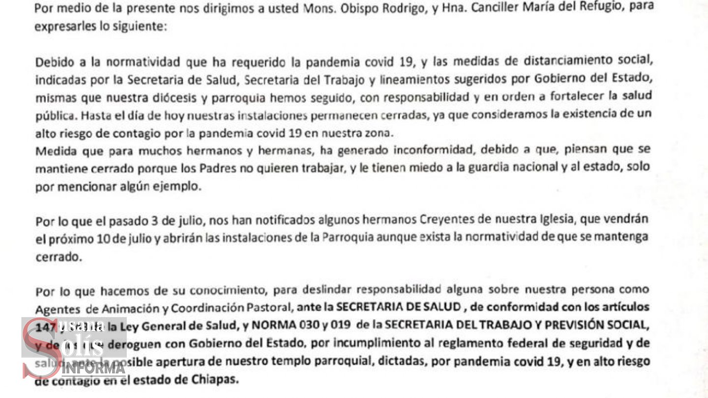El pasado 3 de julio los creyentes notificaron a la iglesia que “vendrán el próximo 10 de julio y abrirán las instalaciones de la parroquia aunque exista la normatividad de que se mantenga cerrado” dice el documento.