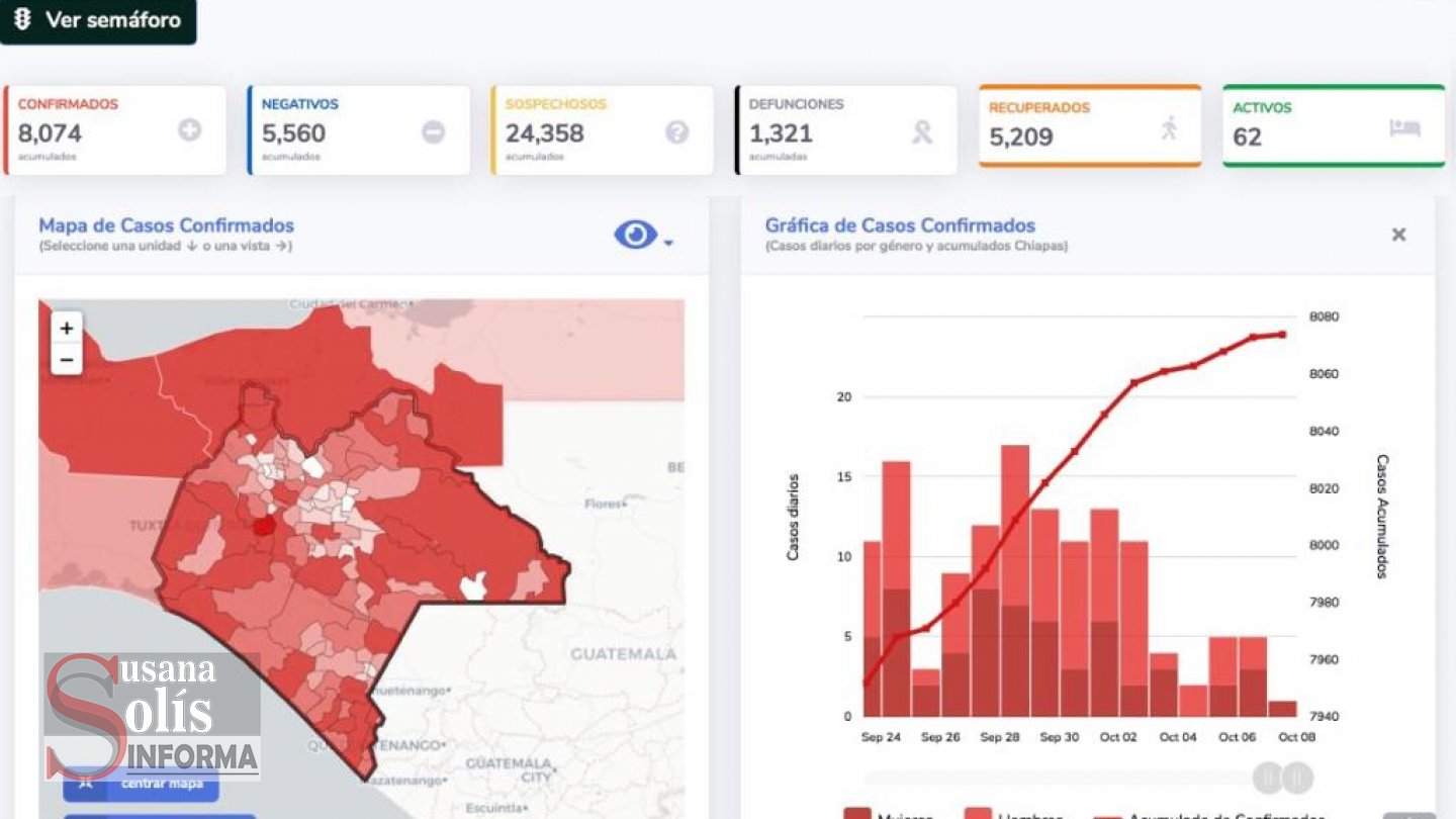 Hasta el 7 de octubre, en la página oficial de la Secretaría de Salud www.coronavirus.gob.mx, publicó un total de 1095 fallecimientos registrados para Chiapas y un total acumulado de 5 mil 596 casos confirmados.