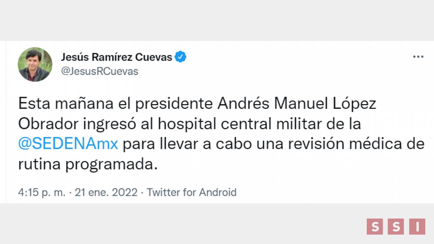 El vocero de la Presidencia de República, Jesús Ramírez Cuevas dio a conocer en su cuenta de Twitter que el presidente Andrés Manuel López Obrador, acudió a una revisión de rutina en el Hospital Central Militar.