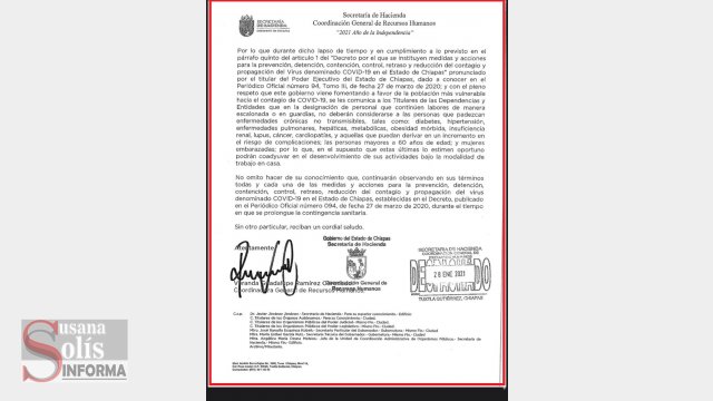 El gobierno de Chiapas, amplió la suspensión de labores a los burócratas hasta el 26 de febrero de 2021, reanudándose las actividades a partir del lunes 1 de marzo como notificó la secretaría de Hacienda en la circular 003/2021.