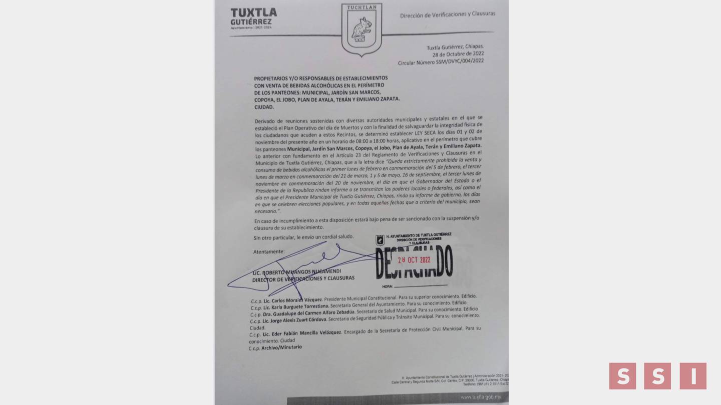 Y es que, derivado de reuniones sostenidas con diversas autoridades municipales y estatales en el que se estableció el Plan Operativo del día de Muertos "Queda estrictamente prohibida la venta y consumo de bebidas alcohólicas en todas aquellas fechas que a criterio del municipio, sean necesario" tal como se establece en el Artículo 23 del Reglamento de Verificaciones y Clausuras en el Municipio de Tuxtla Gutiérrez, Chiapas, que lo dice a la letra. Finalmente, la dirección aseguró que, en caso de incumplimiento a esta disposición estará bajo pena de ser sancionado con la suspensión y/o clausura de su establecimiento.