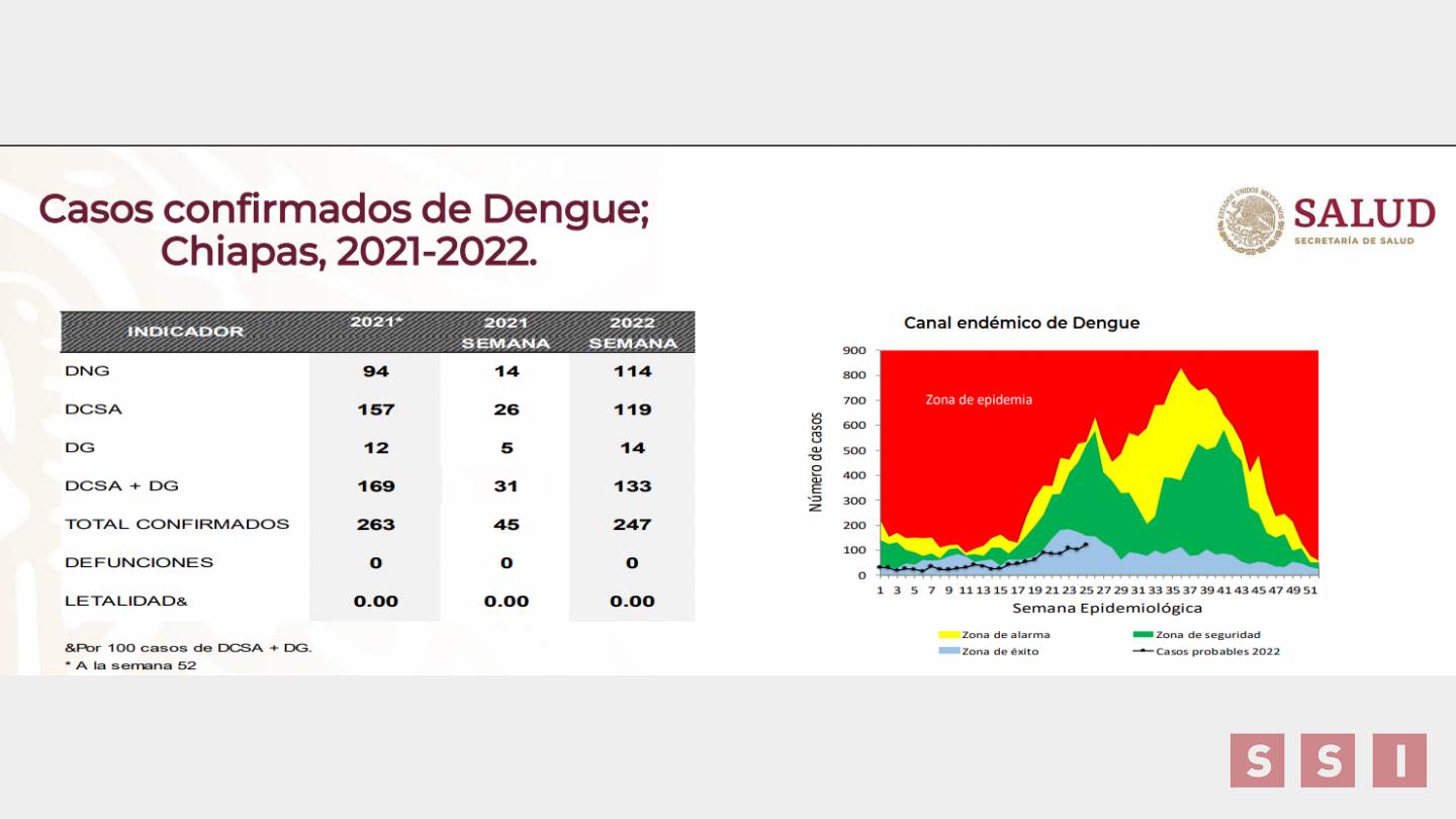 La entidad chiapaneca se ubica en tercer lugar de la tabla nacional después del Estado de México con 569 y Tabasco con 308. Cabe mencionar que, de los 247 casos, 14 son personas con dengue grave.