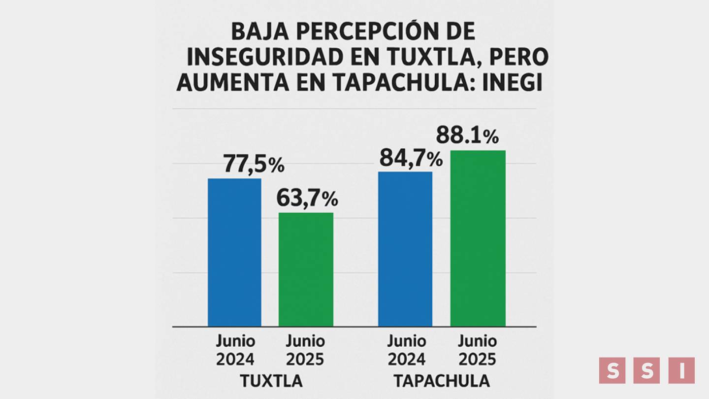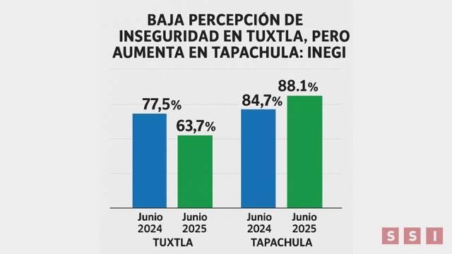Según los datos, en junio de 2024, el 77.5% de la población de Tuxtla Gutiérrez manifestó sentirse insegura; para junio de 2025, este porcentaje descendió a 63.7%, una mejora de 13.8 puntos porcentuales, lo que la convierte en una de las ciudades con mayor disminución a nivel nacional en este rubro.