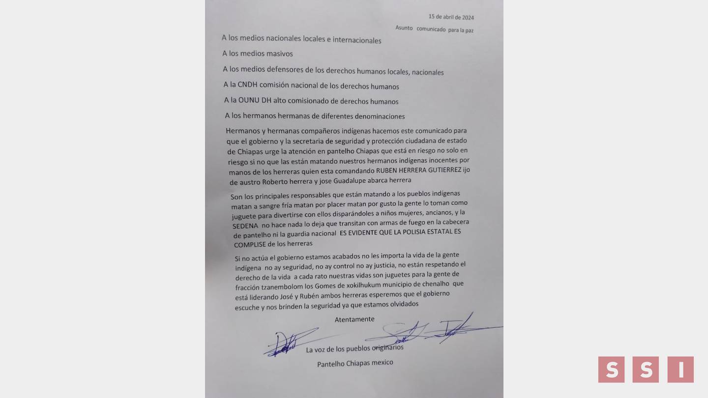 “Y se aclara que se aperturará el camino hasta que estén aprehendidos todos los sicarios y en caso de no cumplir se tomará acciones contundentes por parte del pueblo, y dejando muy en claro que no culpen al pueblo de Pantelhó ni a la autodefensa de lo que decida el pueblo”, puntualiza el documento.
