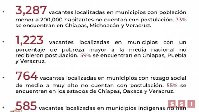 764 vacantes localizadas en municipios con rezago social de medio a muy alto ni cuentan con postulación y es el 55 por ciento ubicadas en Chiapas, Oaxaca y Veracruz.