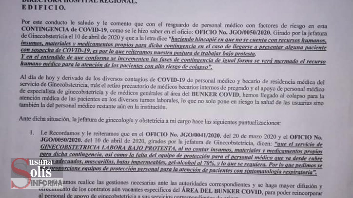 Con fecha 15 de junio, el oficio No JGO/0088/2020,dirigido a la Dra. Olivia Karen Franco Tovilla, Directora del Hospital Regional, señala “Al día de hoy y derivado de los diversos contagios de COVID-19 de personal médico y becario de residencia médica del servicio de Ginecobstetricia, más el retiro precautorio de médicos becarios internos de pregrado y el apoyo de personal médico de especialista de ginecobstetricia y de médicos generales al área del BUNKER COVID, hemos llegado al colapso para la atención médica de las pacientes en los diversos turnos laborales, lo que no solo pone en riesgo la salud de las usuarias sino también la del personal médico restante aún en la institución”.