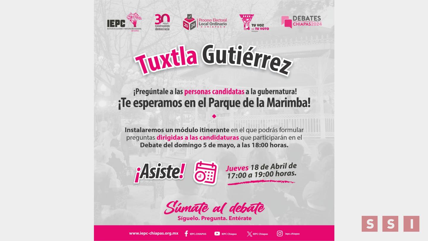 El Instituto de Elecciones y Participación Ciudadana (IEPC) convoca a la población chiapaneca a asistir este jueves 18 de abril de 17:00 a 19:00 horas en el Parque de la Marimba donde instalarán un módulo itinerante en el que podrán formular preguntas dirigidas a las candidaturas que participarán en el debate del próximo 5 de mayo.