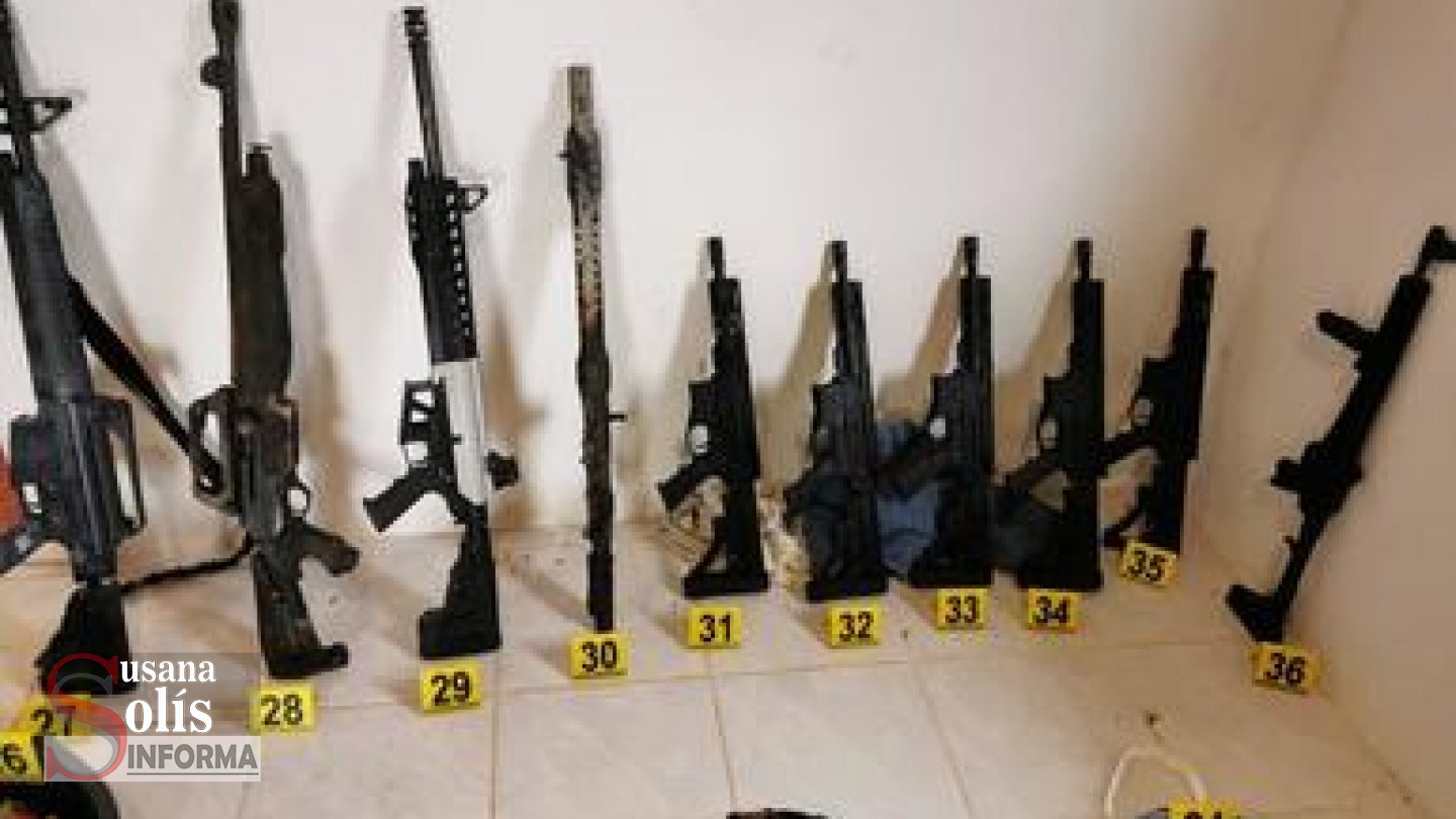 Derivado del cateo se detuvo a dos sujetos a quienes se les aseguraron 10 armas largas, dos armas cortas, 51 cajas con cartuchos útiles, 27 cargadores y dos básculas grameras, además de teléfonos celulares y equipo de cómputo.