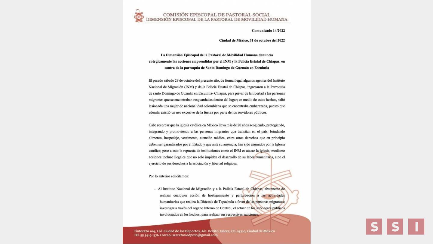 La Dimensión Pastoral de Movilidad Humana y la Diócesis de Tapachula, denunciaron las acciones emprendidas por el Instituto Nacional de Migración (INM) en contra de la parroquia de Santo Domingo de Guzmán en Escuintla donde privaron de la libertad a personas migrantes.