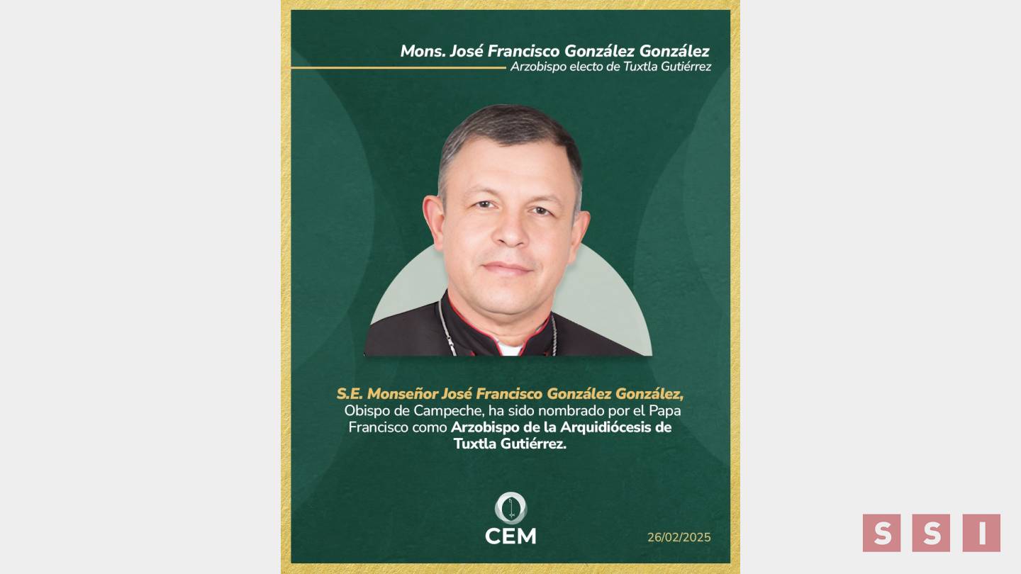 La Nunciatura Apostólica dio a conocer a través de la Secretaría General de la Conferencia del Episcopado Mexicano, que su Santidad Francisco nombró Arzobispo de la Arquidiócesis de Tuxtla Gutiérrez a Mons. José Francisco González González, hasta ahora Obispo de Campeche.