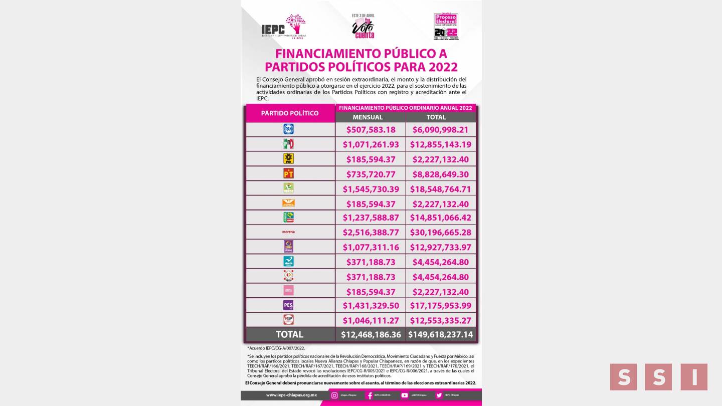El financiamiento público para el sostenimiento de actividades ordinarias permanentes que recibirá cada partido político durante 2022, es el siguiente: Partido Acción Nacional: 6 millones 90 mil 998.21 pesos; Partido Revolucionario Institucional: 12 millones 855 mil 143.19 pesos; Partido de la Revolución Democrática: 2 millones 227 mil 132.40 pesos; Partido del Trabajo: 8 millones 828 mil 649.30 pesos; Partido Verde Ecologista de México: 18 millones 548 mil 764.71 pesos; Movimiento Ciudadano: 2 millones 227 mil 132.40 pesos. Asimismo, se le otorgarán a Chiapas Unido, 14 millones 851 mil 066.42 pesos, a Morena 30 millones 196 mil 665.28 pesos, a Podemos Mover a Chiapas 12 millones 927 mil 733.97 pesos, a Nueva Alianza Chiapas 4 millones 454 mil 264.80 pesos, al Partido Popular Chiapaneco 4 millones 454 mil 264.80 pesos, al partido Fuerza por México 2 millones 227 mil 132.40 pesos, al Partido Encuentro Solidario Chiapas 17 millones 175 mil 953.99 pesos y a Redes Sociales Progresistas Chiapas 12 millones 553 mil 335.27 pesos.