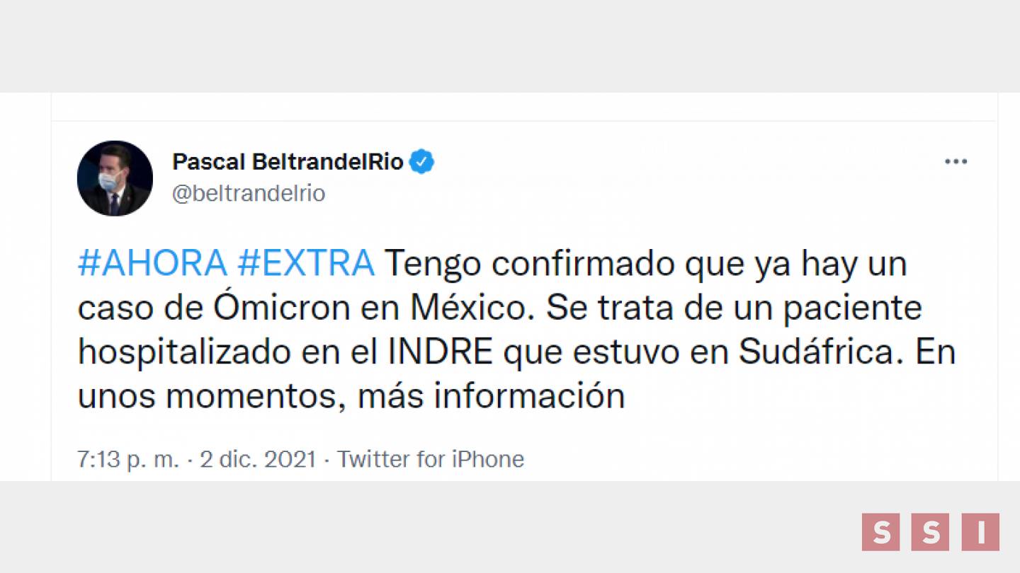 El periodista Pascal Beltrán confirmó que hay un caso de la variante ómicron en México. “Se trata de un paciente hospitalizado en el INDRE que estuvo en Sudáfrica.