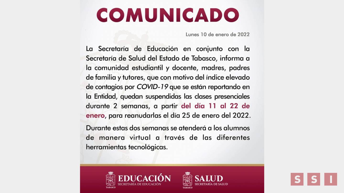 La Secretaría de Educación en conjunto con la Secretaría de Salud en Tabasco, informaron que con motivo al alto índice elevado de contagios de COVID-19 que se presentan, se suspenden las clases presenciales durante dos semanas.