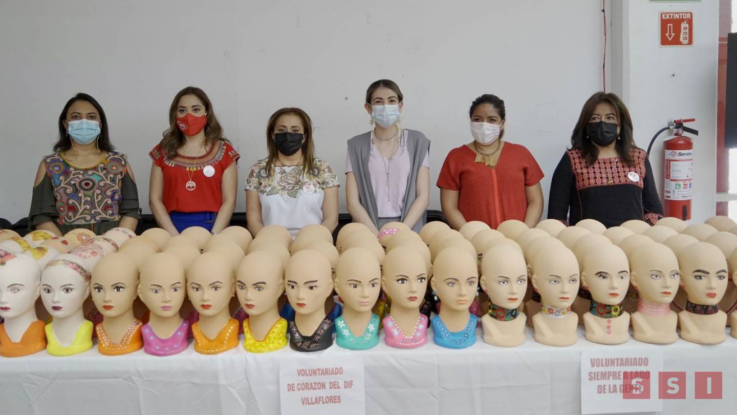 La presidenta del Voluntariado “Siempre al lado de la gente”, Lupita Gómez Casanova, hizo entrega de cabecitas para pelucas oncológicas al Voluntariado de Corazón que preside Rosalinda López Hernández, las cuales serán destinadas a niños, niñas y mujeres que luchan contra el cáncer en Chiapas.