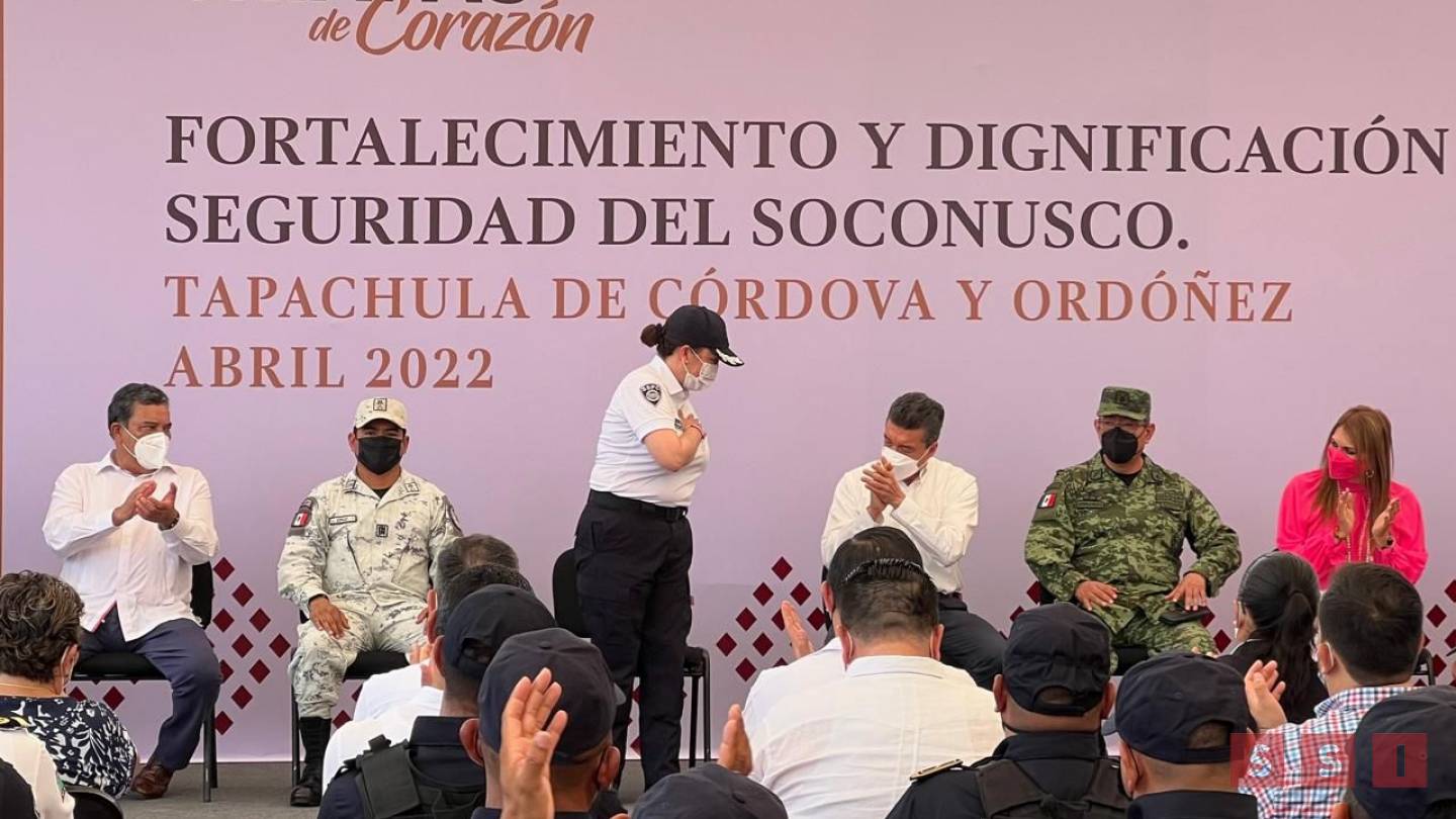 En el marco del Programa Fortalecimiento y Dignificación Policial Estatal para la Seguridad del Soconusco, que encabezó el gobernador Rutilio Escandón Cadenas en Tapachula, la secretaria de Seguridad y Protección Ciudadana, Gabriela Zepeda Soto, destacó la visión de mandatario estatal para eficientar de manera responsable y honesta los recursos públicos y priorizar políticas públicas que garanticen la seguridad, el orden y la paz en Chiapas.