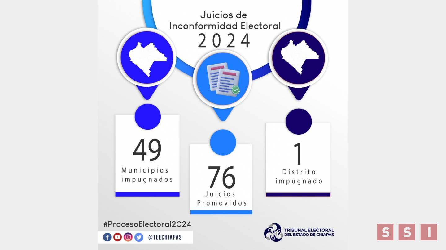 Después de la jornada comicial del pasado 2 de junio, el Tribunal Electoral del Estado de Chiapas (TEECH) ha recibido 76 Juicios de Inconformidad en contra de las elecciones de miembros de Ayuntamientos en 49 municipios y 01 juicio de inconformidad en contra de la elección de diputado local por el distrito XXII con cabecera en Chamula.