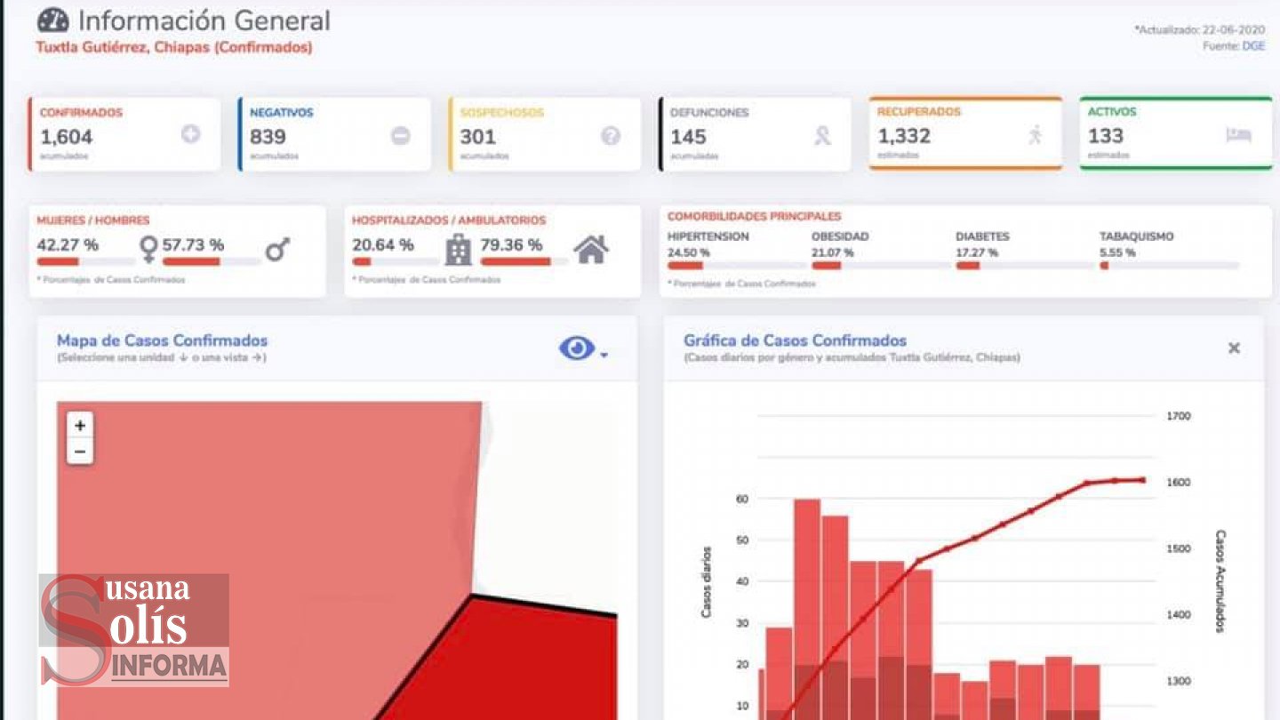 San Cristóbal registra este 22 de junio, 273 casos confirmados, 22 defunciones, 185 recuperados, 31 casos activos y 29 sospechosos, mientras que Comitán reporta 99 casos confirmados, 15 defunciones, 23 sospechosos y 75 recuperados.