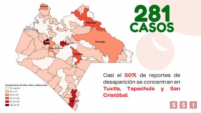 El estudio de la REDIAS que es una alianza de organizaciones de la sociedad civil que trabaja con el objetivo común de promover y defender los derechos de niñas, niños y adolescentes en la entidad, revela que casi el 50 por ciento de reportes de desaparición se concentra en Tapachula, San Cristóbal de Las Casas y Tuxtla Gutiérrez.