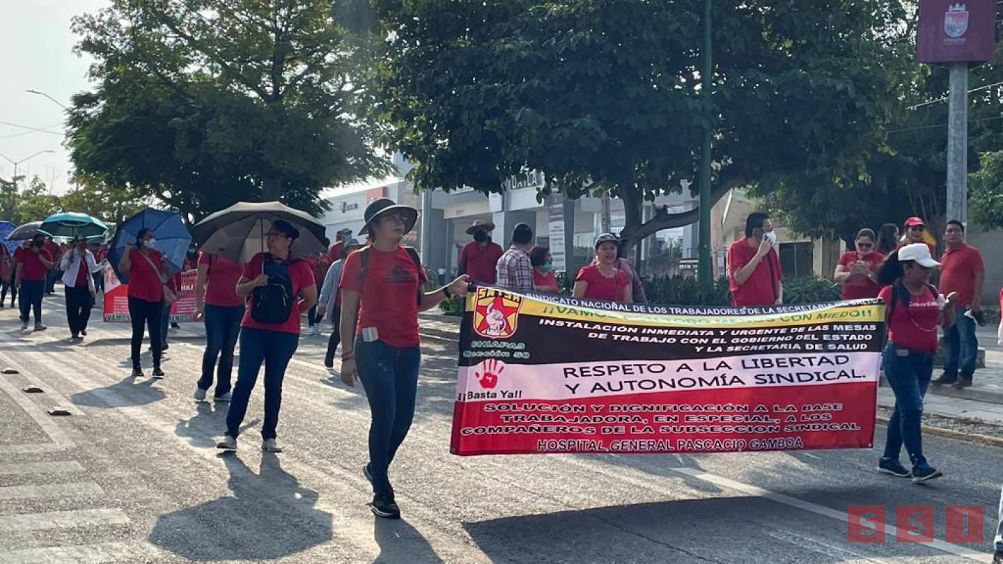 Unos tres mil trabajadores de 25 mil de 13 regiones que integran el Sindicato de Trabajadores de la Salud en Chiapas Sección 50, se manifestaron este día en las principales calles de Tuxtla Gutiérrez, para pedir una mesa de dialogo con autoridades estatales para plantear un pliego petitorio.