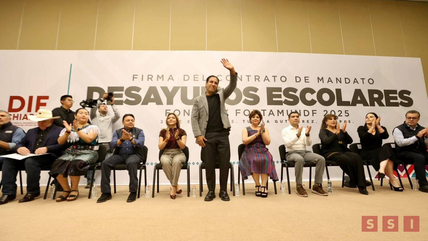 Al atestiguar la firma del Contrato de Mandato para el Proyecto Desayunos Escolares, con la presencia de las y los presidentes municipales de todo el estado, el gobernador Eduardo Ramírez Aguilar refrendó su compromiso con la salud de la niñez chiapaneca y aseguró que se garantizará que los alimentos que se les brindan cumplan con los estándares nutricionales, a fin de que puedan crecer sanos y fuertes.