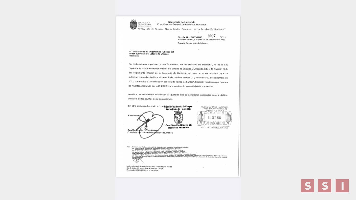 El gobierno de Chiapas a través de la Secretaría de Hacienda, notificó a los trabajadores en la circular SH/CGRH/0037/2022 de la suspensión de labores con motivo a la celebración del “Día de todos los Santos” los días lunes 31 de octubre, martes 1 de noviembre y miércoles 2 de noviembre.