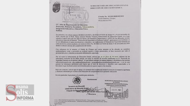 En el oficio SE/SEE/DEB/002/2021 requirieron a los jefes de departamento de las escuelas de nivel Preescolar, Primaria, Secundaria, Telesecundaria, Integración Educativa y Educación Física, un informe de los indicadores y escuelas certificadas en el “Protocolo de Seguridad Sanitaria en el entorno Laboral”.