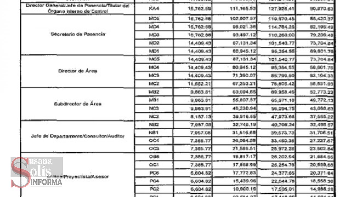 Un secretario de ponencia, gana entre 95 mil 354 pesos y 119 mil 570 ya sin impuestos, mientras que un director de área percibe entre 78 mil 805 y 101 mil 540 pesos; en tanto que los subdirectores entre 47 mil 973 pesos y 69 mil 958 pesos ya descontados sus impuestos.
