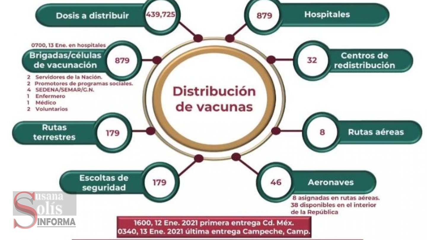 Estiman que a finales de marzo estarán vacunados todos los adultos mayores.  Llegarán las vacunas a 879 hospitales del país, a través de 32 centros de distribución, en 8 rutas aéreas con 46 aeronaves con el apoyo de 179 escoltas de seguridad.