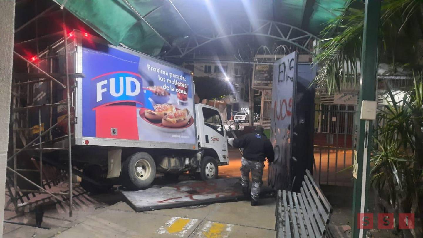 Un vehículo de una empresa nacional fue chocado en la entrada principal de la dependencia estatal causando destrozos en el portón y rejas.